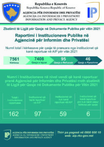 Në zbatim të Ligjit për 06/L-081 për Qasje në Dokumente Publike dhe me qëllim të sigurimit të transparencës së plotë të punës, institucionet publike janë të obliguara që t’i ofrojnë Agjencisë për Informim dhe Privatësi një raport vjetor ku përfshihet numri i rasteve në të cilat institucioni publik ka lejuar qasjen, numrin e rasteve në të cilat institucioni publik ka refuzuar qasjen në dokumente, si dhe arsyet e këtyre refuzimeve.